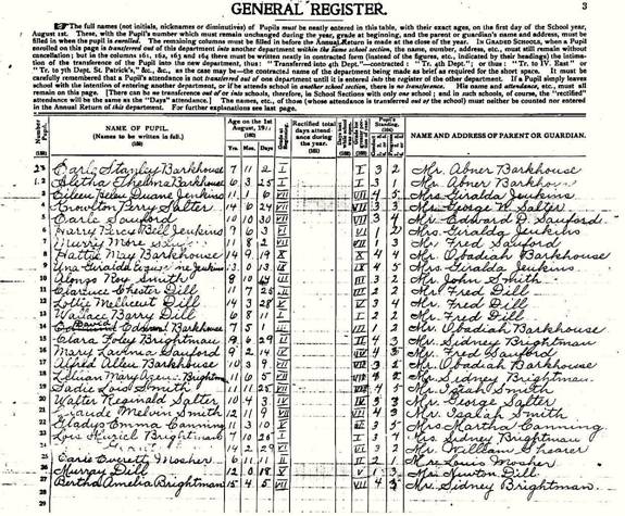 Trustees – Austin Salter, Sydney Brightman, Fred Dill. Secretary - George Salter Note seven grade X and one grade XI student enrolled with six in grade I! Is this the Register for 1915/16 or 1916/17? Many lifelong residents of Upper Burlington are on this list, but if 1916/17 the ages are off by a year for those with registered births. Several of the 1911/12 students are here, progressing through their years. Conduct and progress scores seem improved. Total days of attendance have a wide variation among the students. WWI was raging, but without radio or TV, and few newspaper subscribers, it is likely these pupils were affected only if a relative such as Vincent Dill, uncle of young Wallace on line 7, was enlisted. B4