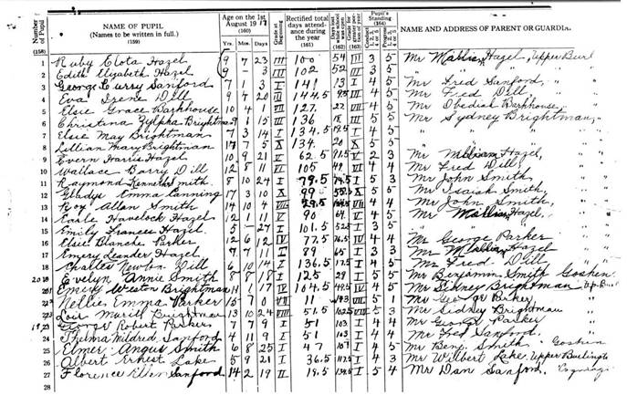 The date says 1917, but the continuing students are all two years older than the 1916 list, or is that the 1915 list? Future teacher Thelma Mildred Sanford is on this list age almost 5. She returned to teach for several years between 1930 and 1939. Her sister-in-law Hattie May Barkhouse on the 1911 list also returned to teach at her old school in the year of the Spanish Flu Epidemic after WWI. Two students from Goshen, Evelyn and Elmer Smith, are registered for the year. They would have been several miles from the nearest school back there so living with a relative and attending school in Upper Burlington would have been a practical alternative. Emery Hazel and Charles Dill at lines 17 and 18 and both in grade I, probably shared one of the old two-seat desks in the school. They were still together 46 years later, commuting to their carpentry jobs in Halifax. Emery was late for their connection in Union Corner one morning. He apologized but said he couldn’t have driven any faster to the rendezvous point. “Charlie, I looked out the side as I was coming across the flat in Scotch Village and those telephone poles looked just like a picket fence!”